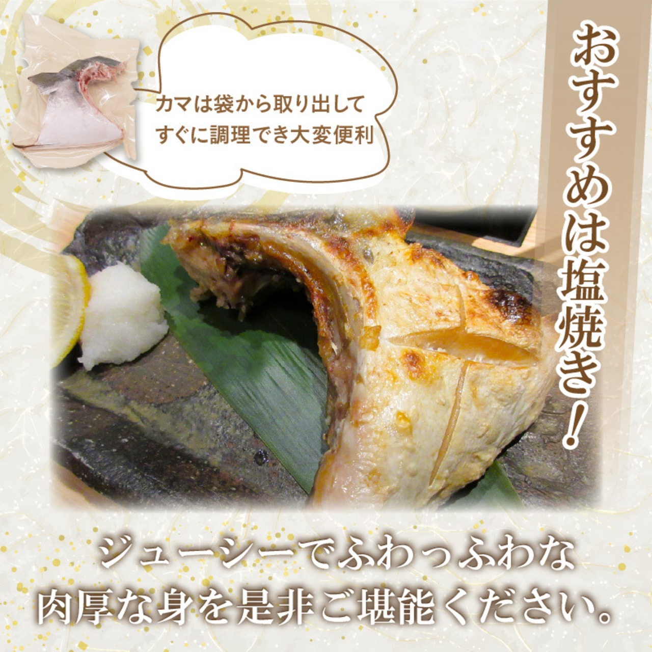 10kg以上の寒ぶりのみを使用していますので、カマもとても美味しくお召し上がりいただけます。